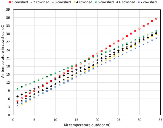 Figure 4. Air temperatures in cowsheds related to outdoor temperatures.
