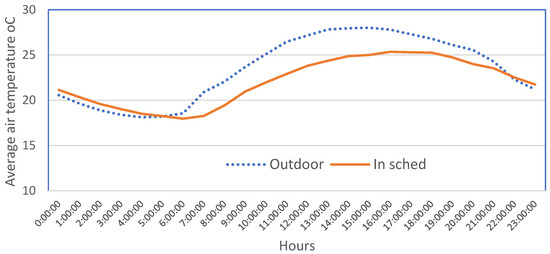 The air temperature in the semi-warm cowshed rises above 25 °C from 13:00 until 20:00 (Figure 5), an average of 7 h during the day. Such temperatures occur in semi-warm cowsheds (cowshed four; cowshed six) on average throughout July. The maximum temperature is 16:00–17:00, it rises to 27.29 ± 0.16 °C. Analyzing temperatures from 7:00 p.m. until 20:00, we found that the temperature in the cowshed was on average 0.56 ± 0.12 °C higher than outside. The fans installed in the cowsheds do not cool the barn, they only intensify the convective heat exchange between the animal and the ambient air.