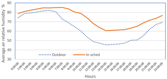 The situation is better in cowshed seven, which is equipped with an air humidification–cooling system. During heat, the air temperature in the cowshed is lower than in the open air, when humidification is activated at temperatures above 20 °C. It runs from 7:00 p.m. until 20:00. The average data for the first decade of July show that in this cowshed during the heat from 7:00 am. until 20:00 the air is on average 2.61 ± 0.74 °C cooler than outdoors (Figure 6). However, the air in the cowshed is wetter. The relative humidity of the air in the cowshed during heat is on average 16.29 ± 4.12% wetter than in the open air.