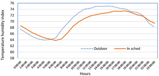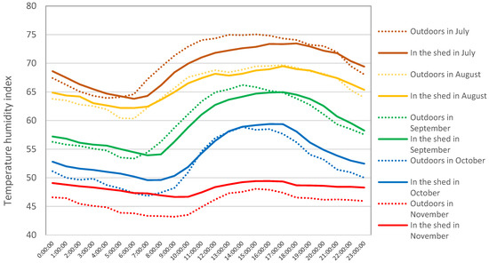 When the weather cools down in September–November and no humidification–cooling is used, the temperature–humidity index in the barn is higher than in the field (Figure 8).