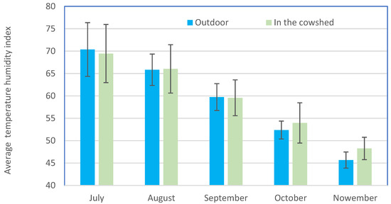 In July, the THI in the field was higher than in the barn, equal to 70.6 ± 6.4 and 69.5 ± 5.9, respectively. In August, when the irrigation system is used less, the difference between the temperature and humidity index in the barn and in the field decreases: in the field it is 65.8 ± 3.5, and in the barn 66.0 ± 5.4. In November, when the irrigation system is not used, the THI is significantly higher in the barn: 48.3 ± 2.4 in the barn and only 45.6 ± 1.8 in the field (Figure 9). This shows efficient air cooling using an air humidification system.