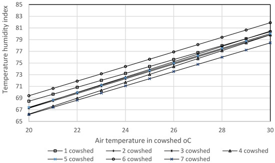 During the research, microclimate factors were recorded in 5–7 places in cowsheds and 2 places in the field. The efficiency of ventilation systems was evaluated by analyzing air temperature and relative humidity in the barns. Thermal comfort is measured by the temperature and humidity index (THI), which is calculated by the equation [22]:
