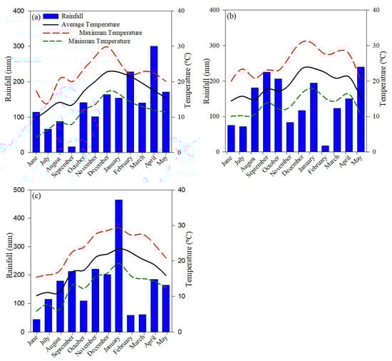 The climate in the region is classified as humid subtropical (Cfa) []. The mean temperature in the region is 18.4 °C and the mean annual rainfall is 1467 mm. Climatic variables, namely minimum, median, and maximum temperature, as well as accumulated monthly rainfall, were monitored in the experimental site throughout all of the assessed growing seasons (Figure 1). Cover plants Desmodium afinne Schltdl., Lolium multiflorum, Vicia sativa, and Raphanus raphanistrum and grasses native to the Pampa biome, such as Paspalum notatum, Paspalum plicatulum, and Axonopus affinis, prevailed between grapevine rows. Cover plants were cut three times, at 10 cm cutting height; their waste was deposited on the soil surface. Vegetation in grapevine rows was removed three times a year, on average, by using non-residual herbicide.