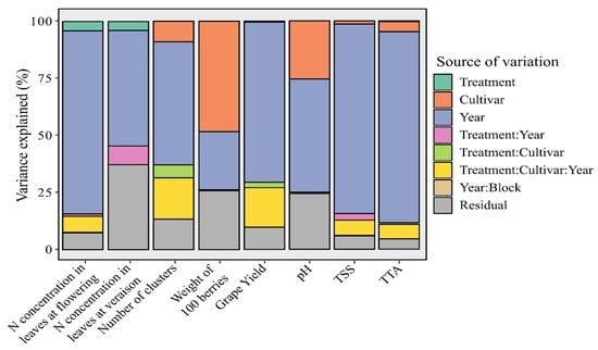 Visual representation of variance components. The colors represent the source of variation (treatment, cultivar, year, interactions, and residual). Response variables (plant tissue, grape yield, and composition) are shown on the X-axis. The variation proportion explained by each source of variation for each response variable is observed on the Y-axis (percentage).