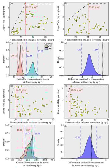 The critical N concentration was similar between cultivars in leaves collected at veraison. N critical levels in the leaves at veraison were 19.78 g N kg−1 (Figure 3e) and 20.62 g N kg−1 (Figure 3f) in the cultivars ‘Chardonnay’ and ‘Pinot Noir’, respectively. The highest probability of critical N concentration occurrence at veraison, based on the density of value distributions, ranged from 18.18 to 20.91 g N kg−1 in the cultivar ‘Chardonnay’ and from 18.78 to 21.76 g N kg−1 in the cultivar ‘Pinot Noir’ (Figure 3g). Thus, it was possible observe that according to the distribution amplitude between critical N concentrations differences between cultivars (from −3.95 to 1.73 g kg−1), critical N concentrations are not different (they reached the black dashed line, which refers to zero) (Figure 3h). Moreover, the N concentration in the leaves in both cultivars and the critical concentrations of it were lower at veraison (Figure 3c,g).