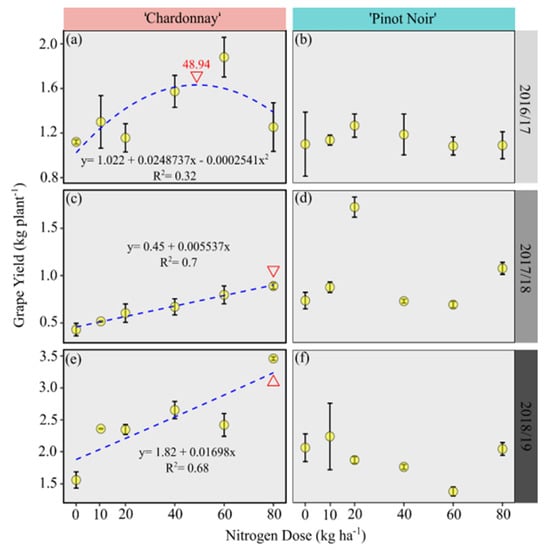 Maximum technical efficiency (MTE) doses of N fertilizer to ‘Chardonnay’ (a,c,e) and ‘Pinot Noir’ (b,d,f) cultivars grown in sandy soil during 2016/17, 2017/18, and 2018/19.