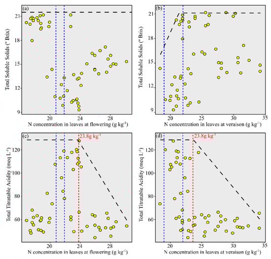 Relationship between N concentration in leaves at flowering and veraison and the total soluble solids (a,b), and the total titratable acidity (c,d) of ‘Chardonnay’ grape must during 2016/17, 2017/18, and 2018/19. Blue dashed lines represent the proposed N sufficiency ranges based on maximum grape yield.
