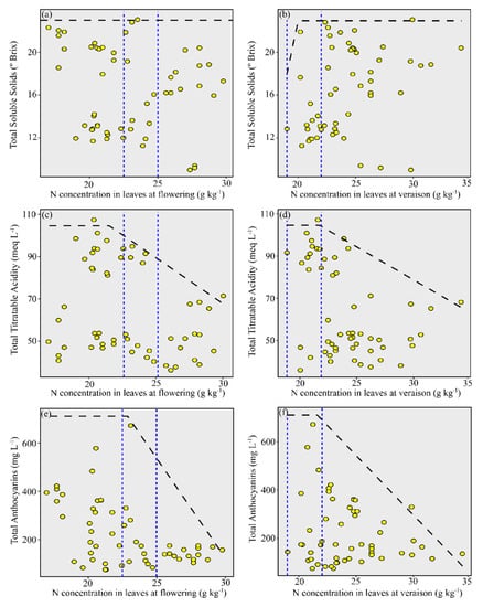 Relationship between N concentration in leaves at flowering and veraison and the total soluble solids (a,b), and the total titratable acidity (c,d), and total anthocyanins (e,f) of ‘Pinot Noir’ grape must during 2016/17, 2017/18, and 2018/19. Blue dashed lines represent the proposed N sufficiency ranges based on maximum grape yield.