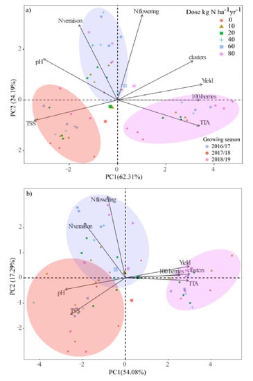Relationship between principal component 1 (PC1) and principal component 2 (PC2) for response variables analyzed in field experiments with ‘Chardonnay’ (a) and ‘Pinot Noir’ (b) cultivars subjected to N fertilization in the soil, during 2016/17, 2017/18, and 2018/19.