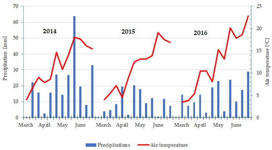 Average decade air temperatures and precipitation in period March–June in study years (2014–2016).