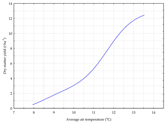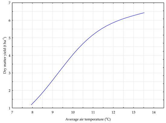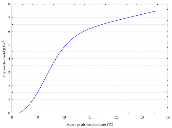 In our study, the average daily air temperature calculated for the period ranging from the spring onset of vegetation to the harvest date was the independent variable with the greatest influence on the values of most of the tested dependent variables. In all the deterministic models, the dry matter yield tended to increase along with the average daily air temperature. However, this increase was curvilinear and reached the maximum values when temperatures exceeded 10 °C. This is consistent with other scientific reports, according to which the grass growth rate is controlled by three factors: temperature, soil moisture content, and the intensity of sunlight. Of these three factors, it is temperature that has the greatest influence on the grass growth rate, especially in the spring, because it determines the rate of plant development and the structure of the root mass and aerial parts of plants [14,79]. In Poland, the grass growing season is assumed to begin when the average daily air temperature exceeds 5 °C for five consecutive days [80]. Depending on the region and the year, this moment may occur as early as the beginning of March. Taking the temperature above 5 °C as the starting point, the higher the temperature, the faster the sward growth rate is until the temperature is about 10 °C [81,82]. Most grass species achieve the maximum growth rate at an average daily temperature of about 10 °C. A further increase in temperature has little influence on the growth rate of grassland plants. Therefore, the temperature range of 10–15 °C is considered to be optimal for the good development and yield of grassland sward.