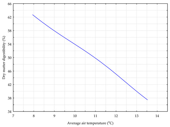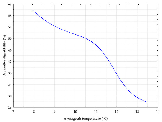 Air temperature affects the intensity of intracellular metabolic processes during plant growth. It causes changes in the chemical composition of plants, mainly in the formation of structural carbohydrates, such as hemicellulose, cellulose, and lignin, which influence the digestibility of feed [71,83]. In our study, the average daily temperature also influenced the digestibility of the dry matter of grasses (DIG_G model) and grasses with bird’s foot trefoil (DIG_GB). There was a rectilinear decrease in the digestibility of dry matter observed along with an increase in the average daily temperature calculated from the vegetation onset to the harvest day. A similar phenomenon was observed by Żurek [84], who analysed the relationship between the digestibility of the dry matter of rescuegrass (Bromus willdenowii) and tall fescue (Festuca arundinacea) and the average daily air temperature during the growing season in Poland. Like in our study, the digestibility of the dry matter of both grass species tended to decrease as the average daily air temperature increased. The average daily temperature also influenced the yield of protein from the grass sward (P_G model) and the grass and red clover sward (P_GC). The protein yield, being the resultant of the dry matter yield and protein content in the harvested crops, increased along with the average daily temperature in both cases. However, there were differences in this increase influenced by the sward species composition. The fastest increase in the protein yield in the grass sward was observed at 10–13 °C, which is the optimal temperature range for grasses. In the grass and clover sward, the most intense increase in the protein yield was observed within a very narrow range of temperatures, i.e., 8.5–9.5 °C. There was no increase in the protein yield at temperatures higher than 9.5 °C.