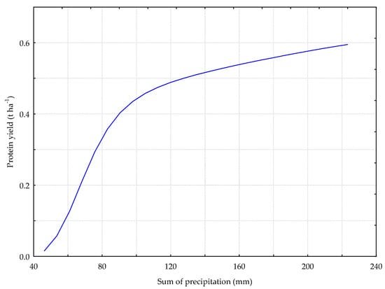 Figure 9 shows the relation between the yield of protein from the sward with the predominance of grasses and bird’s foot trefoil and the total rainfall in the test period (PREC_S). As seen from the data, the higher the rainfall in the period ranging from the spring onset of vegetation to the harvest date was, the higher the yield of protein from the harvested biomass was.