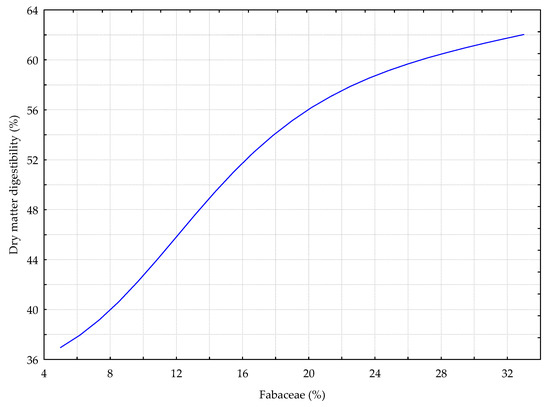Figure 11 shows the data referring to the dependence between the percentage of digestibility of the dry matter from the sward with the predominance of grasses and red clover (DIG_GC model). An increase in the percentage share of legumes (%_L) caused an increase in the digestibility of the green forage dry matter.