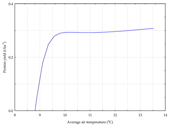 The relation between the average daily air temperature (T_AV)—rank one and the protein yield is presented on Figure 12. An increase in the average daily air temperature to about 9.5 °C stimulated the accumulation of protein in the sward with the predominance of grasses and red clover. When this value was exceeded, the protein yield remained at a steady level of about 0.3 t∙ha−1.
