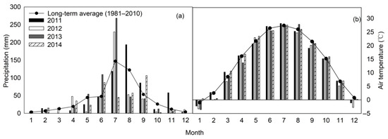 Monthly and long-term average precipitation (a) and air temperature (b) during the experimental periods of 2011–2014 at Ren County, Hebei, China.