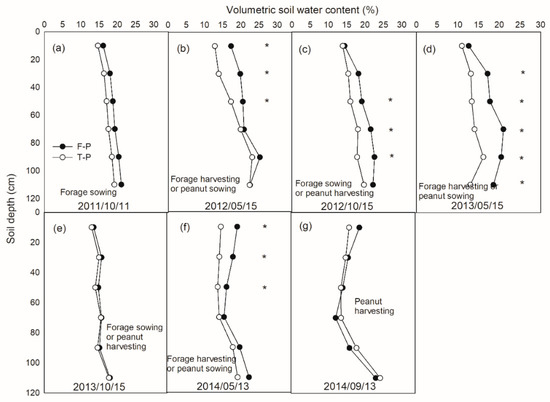 Vertical distribution of volumetric soil water content in the 0–120 cm soil layers of different sowing and harvesting dates of each crop during the experimental period. Within the same soil layer, an asterisk “*” indicates significant difference (p < 0.05) of volumetric soil water content between the treatments. (F-P), fallow–peanut, (T-P), forage triticale–peanut.