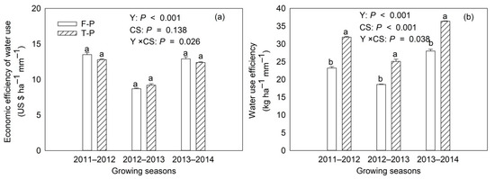 System economic efficiency of water use (a) and water use efficiency (b) over growing seasons for the fallow–peanut (F-P) and forage triticale–peanut (T-P). Analysis of variance results are for the effects of year (Y), cropping system (CS), and their interaction on the system economic efficiency of water use.