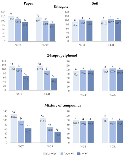Effect of different concentrations of Estragole and 2-Isopropylphenol on Lactuca sativa germination percentage (%GT) and germination rate (%GR), expressed as the percentage relative to the control. Four replicates of each treatment were performed (n = 4 × 50 = 200 seeds in total for each solution). * Significantly different from the controls. ’ Significantly different from the mixture of compounds. a, b, c: differences in small letters indicate significant differences between concentrations of the same index and for each treatment. p < 0.05 (Mann–Whitney U-test).