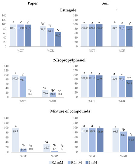 In the tests carried out with Allium cepa on paper, the highest concentration (1 mM) of both estragole and 2-isopropylphenol showed a significantly inhibitory effect on germination rate (%GR). 2-isopropylphenol also showed a significantly inhibitory effect on germination (%GT). At the lowest concentration (0.1 mM), both compounds showed a significantly stimulating effect on these indices, whereas at 0.5 mM, no differences were observed with the control. In soil, these effects disappeared, and no significant differences were found with the control at any of the tested concentrations (Figure 1).