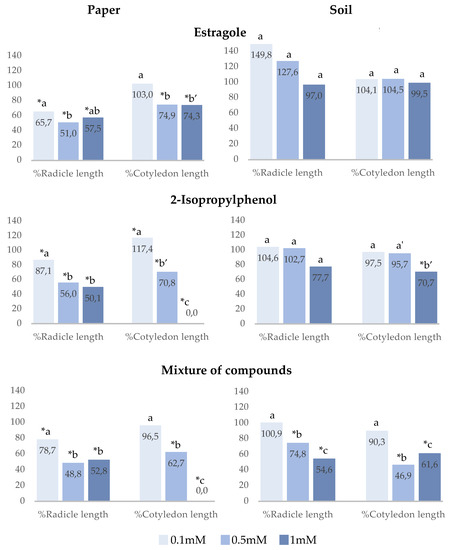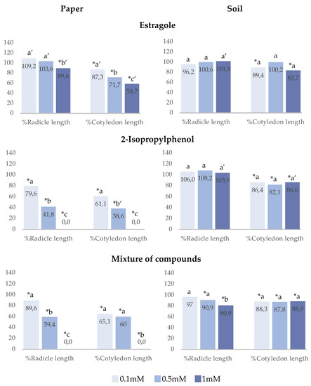 Effect of different concentrations of Estragole and 2-Isopropylphenol on the radicle and hypocotyl length of Lactuca sativa, expressed as the percentage relative to the control. Four replicates of each treatment were performed (n = 4 × 50 = 200 seeds in total for each solution). * Significantly different from the controls. ’ Significantly different from the mixture of compounds. a, b, c: differences in small letters indicate significant differences between concentrations of the same index and for each treatment. p < 0.05 (Mann–Whitney U-test).