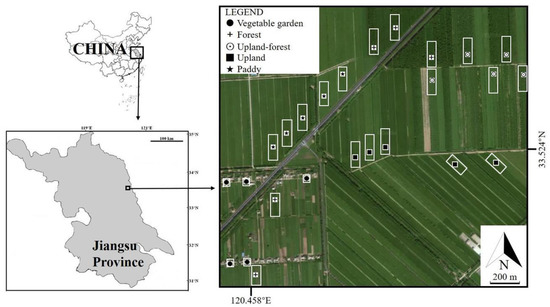 In the study area, five land-use types were identified in the agroforestry ecosystem, which comprised paddy, upland, forest, upland-forest, and vegetable garden, forming mosaic patches. Rice (Oryza sativa L.)-wheat (Triticum aestivum L.)/oilseed rape (Brassica campestris L.) was a primarily planted rotation in the reclaimed lands, referred to as paddy. Some land was planted under upland-based crop rotations, such as wheat maize (Zea mays L.), wheat cotton (Gossypium hirsutum L.), and maize-oilseed rape. And poplar (Populus euramericana) was used for forestation. Upland rotations with lower intensity of land-use were also used in the young poplar forest, including oilseed rape, maize, pumpkin (Cucurbita moschata Duch. ex Poir.), and white gourd (Benincasa hispida Cong.), and this land-use type named upland-forest. The vegetable garden was planted with pakchoi (Brassica chinensis L.), chilli (Capsicum annuum L.), cowpea (Vigna unguiculata L. Walp.), potato (Solanum tuberosum L.), napa cabbage (Brassica rapa var. glabra Regel), and tomato (Lycopersicon esculentum Mill.), etc. The fertilizers applied to the five different lands were listed in Table 1.