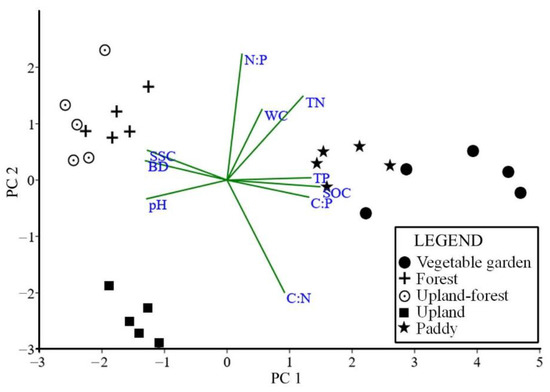 Consistently our study indicated that land-use and land cover conversion under different crop rotation systems also affected the soil properties [37]. SOC and TP were identified as the more important factors for distinguishing the soils under different land-use types (Figure 3); thus, these properties should receive more attention in future soil ecosystem research and management. Human activities may be responsible for the soil property variations, which were related to the plantations on the lands, including plowing, irrigation, and fertilization. The plantation was considered the main factor influencing WC as reported in the previous studies [38,39]. The increased proportions of macroaggregate and SOC are probably the main causes of the lowest BD value of 1.15 g cm−3 [2]. And the highest nutrient accumulation (SOC, TN, and TP) occurred in the topsoil of the vegetable garden (Table 2); and the responses of nutrient elements to land-use conversion might also be due to variations of pH, SSC, and BD caused by the management and plantation as observed in previous studies [2,40]. Additionally, the soil properties in the forest presented intermediate values among land-use types except for SSC, while upland forest had the lowest values of SOC and TP, with similar TN levels to the forest. The highest TP (1.02‰) occurred in the vegetable garden, which may be due to the effect of management practice [2].