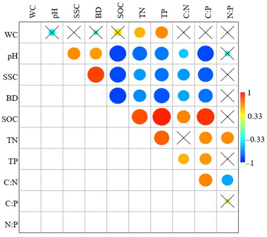 Pearson’s correlations among the topsoil properties and stoichiometric characteristics. The size of the circle is proportional to the r value, and the coefficient of correlation was marked in the color gradient. The “×” mark indicates no significant Pearson correlation (p ≥ 0.050).