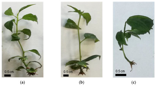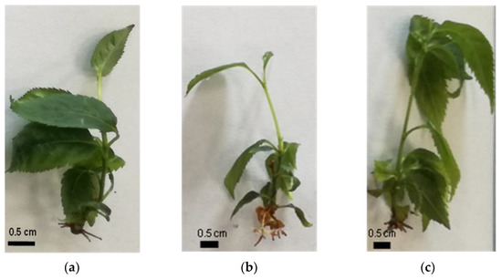 Rooted explants by the effect of (a) dopamine; (b) 5-hydroxy-1,4-naphthoquinone; and (c) chlorogenic acid cultivated in rooting medium in the presence of IBA.