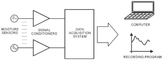 The wetting front velocity determination is based on the use of soil moisture sensors. Soil moisture was measured at several points in the soil samples. For that, a computer-based multi-channel data acquisition system was implemented (Figure 1). The output signal of the sensors was coupled to signal conditioners and fed to a data acquisition system to be processed by a computer program. Data processing and recording were implemented by a program developed in LabVIEW software.