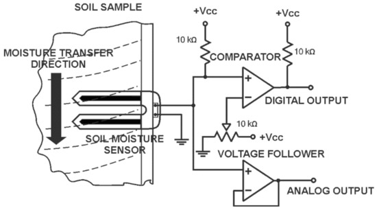 Details for each channel of the sensor circuit are shown in Figure 2. Moisture detection is based on the dependence of the soil’s electrical conductivity on water content. For a high-water content in the soil, the electrical resistivity is low, while for low water content, the electrical resistivity is high. A fork-shaped sensor is nailed into the soil sample to get a measurement of the electrical conductivity. The signal is connected to an electronic circuit with analog and digital outputs. Analog output is processed with a voltage follower for which the output voltage is equal to the input voltage. For the case of the digital output, the signal of the sensor is compared with an adjustable reference voltage to set the threshold for moisture detection. This circuit offers a binary output voltage between 0 V and +Vcc.