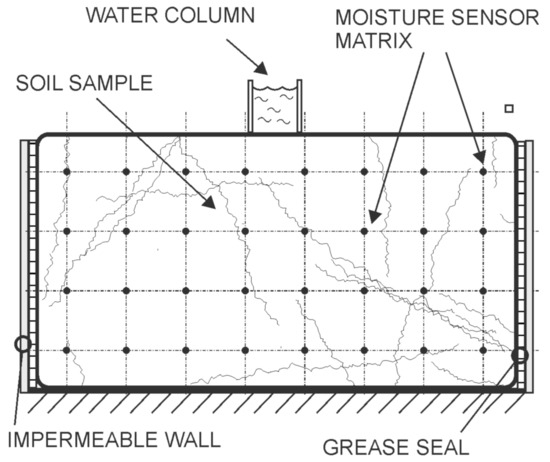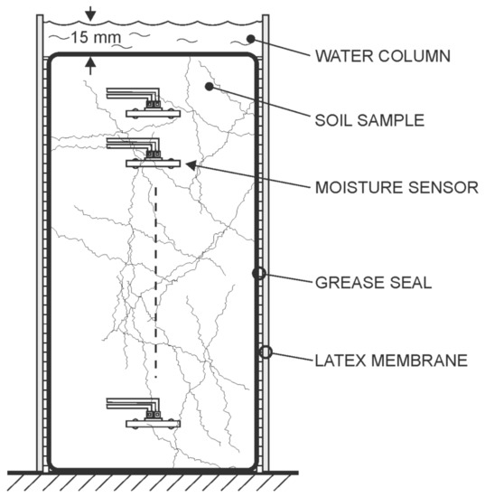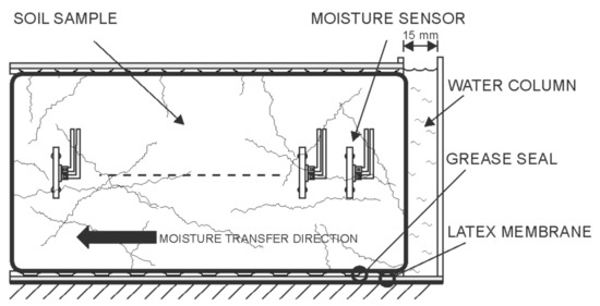 Figure 3 shows the components of the experimental set-up with the soil sample. Moisture sensors were distributed along the soil sample to detect the wetting front advancement. A latex membrane was used to confine the water in the soil, and multi-purpose lithium grease was used as a seal to prevent the water from taking a preferential flow along the walls of the assembly. Sidewall leakage is an important aspect that needs to be addressed. In this regard, other authors have treated clay loam soil with glue and sprayed it with sand to create a coarse surface [19], Vaseline lubricating jelly on the edges of soil chambers [20], or soil specimens tightly wrapped with a resistant filament tape [21]. The arrangement of the soil sample for experiments with horizontal wetting front advancement is shown in Figure 4.