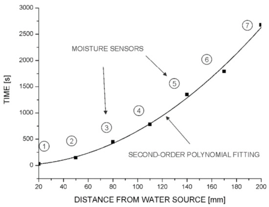 Under the described methodology, the time the wetting front took to reach each sensing point from the surface was measured, and a time vs. distance plot was obtained, as shown in Figure 6. The points in this plot represent the location of the sensors, while the continuous line is a data interpolation.