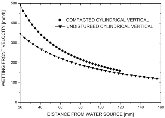 This case analyzes a comparison of results between cylindrical cross-section soil samples for artificially compacted and undisturbed soils placed in a vertical position, as shown in Figure 3. Results for wetting front velocity vs. distance plots were also obtained (Figure 7).
