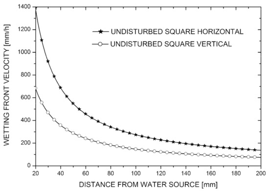 Results shown in Figure 10 (as in Figure 8) also suggest that the wetting front travels faster in the samples positioned in a horizontal direction. This fact is more evident near the water source, where the wetted distance from the water source is higher in the horizontal direction than in the vertical direction. This is in concordance with Figure 8, where the wetting front velocity difference is more evident near the soil sample surface. As expected, as the wetting front travels deeper into the soil sample, velocity values are far more different.