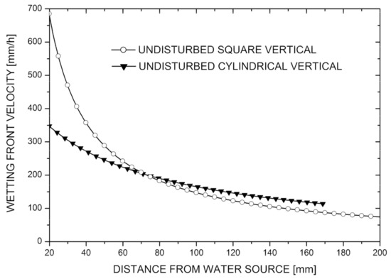 This graph shows that the methodology approach of the present work is sensitive to the wetting front velocity differences between both geometries. Major differences are observed near the surface of the soil samples, while the wetting front velocity values are the same at a distance of 70 mm from the water source. From this point on, measurements do not offer a wetting front velocity difference based on the cross-section for the tested geometries. In fact, velocity trends are reversed after this point, showing a strong dependence of the wetting front velocity on the cross-section of the soil sample.