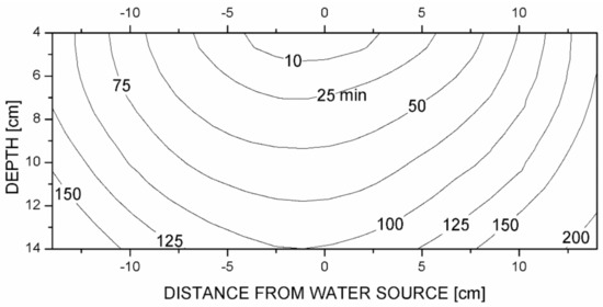 Results for the block soil sample with a water source at the top center are shown in a two-dimensional plot in Figure 10. Isolines are marked with the displacement time of the wetting front.