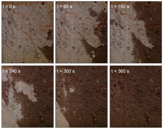 Figure 11 shows results for the undisturbed square cross-section soil sample with water flowing in the horizontal direction, as shown in Figure 4. This figure shows the wetting patterns’ evolution in time on the face of the soil sample opposite to the water source. Wetted soil can be observed in a darker tone.