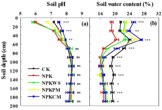 Soil pH and soil water content in the 0–200 cm depth after 32 years of fertilization in Vertisols. (a) Soil pH and (b) soil water content. CK: no fertilization; NPK: chemical fertilizers; NPKWS: NPK plus wheat straw; NPKPM: NPK plus pig manure; NPKCM: NPK plus cattle manure. The asterisks indicate significant differences among planting systems within the same soil layer, * p < 0.05, ** p < 0.01, *** p < 0.001; ns: not significant.
