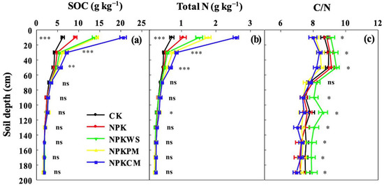 Soil organic carbon (SOC), total N contents and the C/N ratio in the 0–200 cm depth after 32 years of fertilization in Vertisols. (a) Soil organic carbon (SOC), (b) total N and (c) the C/N ratio. CK: no fertilization; NPK: chemical fertilizers; NPKWS: NPK plus wheat straw; NPKPM: NPK plus pig manure; NPKCM: NPK plus cattle manure. The asterisks indicate significant differences among planting systems within the same soil layer, * p < 0.05, ** p < 0.01, *** p < 0.001; ns: not significant.