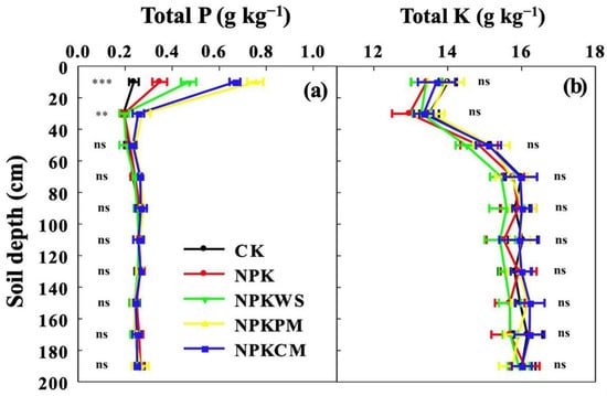Total P and total K contents in the 0–200 cm depth after 32 years of fertilization in Vertisols. (a) Total P and (b) total K. CK: no fertilization; NPK: chemical fertilizers; NPKWS: NPK plus wheat straw; NPKPM: NPK plus pig manure; NPKCM: NPK plus cattle manure. The asterisks indicate significant differences among planting systems within the same soil layer, ** p < 0.01, *** p < 0.001; ns: not significant.