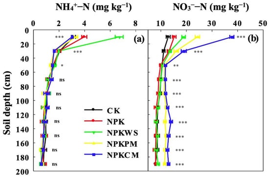 Soil NH4+−N and NO3−−N contents in the 0–200 cm depth after 32 years of fertilization in Vertisols. (a) Soil NH4+−N and (b) soil NO3−−N. CK: no fertilization; NPK: chemical fertilizers; NPKWS: NPK plus wheat straw; NPKPM: NPK plus pig manure; NPKCM: NPK plus cattle manure. The asterisks indicate significant differences among planting systems within the same soil layer, * p < 0.05, ** p < 0.01, *** p < 0.001; ns: not significant.