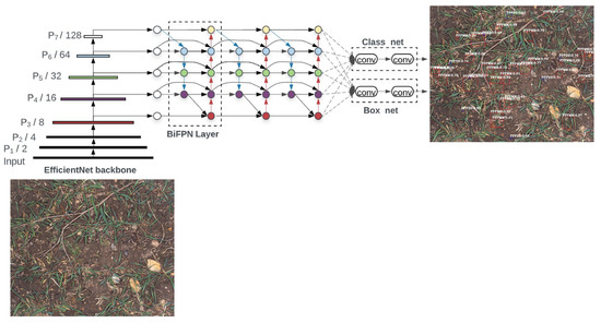 The EfficientDet algorithm was proposed to improve the multiple dimensioned feature fusion structure of FPN and using ideas gained from the EfficientNet model scaling method for reference, EfficientDet comprises three components [34]. As shown in Figure 5, the first component is a backbone which is a pre-trained EfficientNet by ImageNet so that a pre-trained model was used for training on the weed images. The second component is BiFPN, it performs the top-down and bottom-up feature fusion multiple times for the output specifications of levels 3–7 in EfficientNet. The third component is the classification and detection blocks, to classify and return the monocot/dicot weeds in the images. Modules in part two and part three can be repeated multiple times, depending on hardware conditions. EfficientNet-b3 is used as the backbone in order to extract features from the weed images. Then extracted features from P3-P7 passed into BiFPN block for feature fusion. BiFPN pursues a weighted feature fusion approach to gain semantic information of different sizes. Therefore, by following this method, the network can detect very small monocot/dicot weeds in the images which is crucial in recognizing weeds in the agricultural fields.