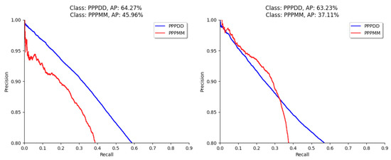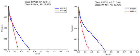 The Precision/Recall curve obtained from the results of the object detection models on the generated synthetic images. Left: EfficientDet, and Right: YOLOv5. In this Figure, PPPMM and PPPDD are monocot/dicot classes, respectively.