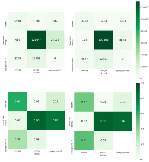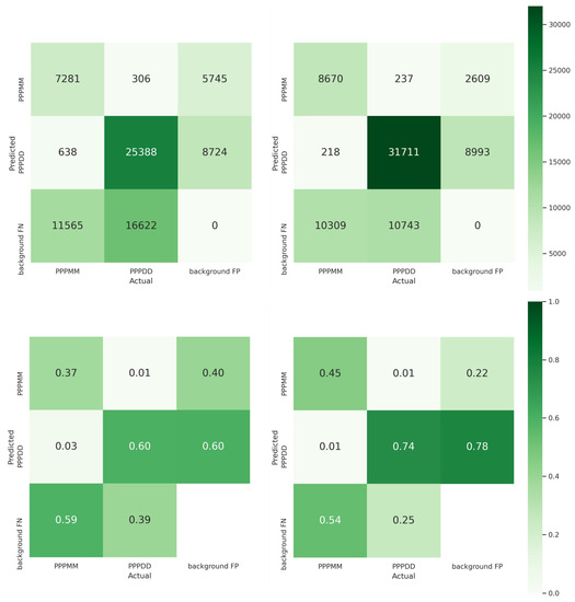 The normalized and non-normalized confusion matrices obtained from EfficientDet (Left) and YOLOv5 (Right) on the in-situ images.