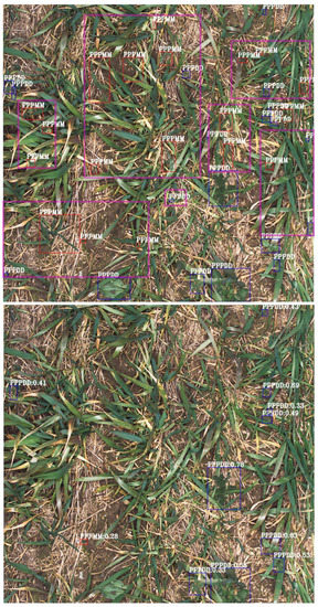 Accordingly, both models had only a few cases that the monocot and dicot misclassified from each other. In addition, based on the obtained results from the confusion matrix, the misclassification rates at detecting monocot/dicot were insignificant and this led us to conclude, both EfficientDet and YOLOv5 were robust enough in detecting monocot/dicots in synthetic samples. Furthermore, the FNR in monocot for EfficientDet and YOLOv5 were obtained 59% and 54%, respectively, which demonstrated that there were significant undetected monocots in the predictions. The main reason for this level of error rate gained from both models could be the difficulty of finding the monocot class with narrow leaves in the cases where both crops and monocots appeared alongside each other in the fields. In such a scene as illustrated in Figure 10, monocots had similar visual properties with the crops so that the detection networks were not able to find and recognize all of the monocots within the images. Therefore, the significant number of monocots had not been detected (Figure 10). In general, the weeds contain various sizes and orientations while in the collected dataset in this study, small to medium-sized dicot weeds were mainly presented in the fields and the experiments approved that our models were able to detect most of them within the images (Figure 10, Figure 11 and Figure 12), the models had seen approximately two hundred thousand thumbnails (objects) within the images. This number of weeds in the training samples played a key role forcing the models to extract only the essential features belonging to the weeds which help both models to be robust in their predictions. Also, the obtained results demonstrated the efficiency and capability of region-based ConvNets on detecting the weed dataset collected in the complex environments in which many of the monocots/dicot were hidden among the dense crops (Figure 12). However, to see how well both models visually performed on the similar test images, the predictions of both models were presented in Figure 12.