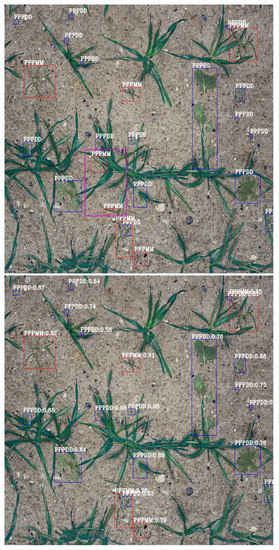 Synthetic images with labels generated by the developed image processing algorithm red (PPPMM) and blue (PPPDD) bounding boxes represent monocot/dicot classes, respectively.