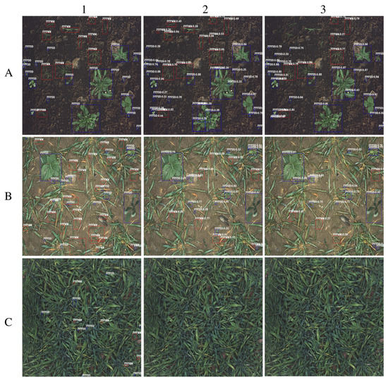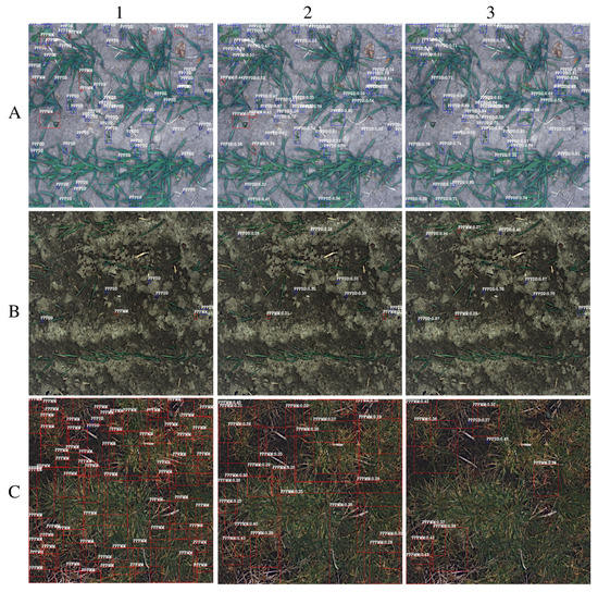 The monocot/dicot prediction by EfficientDet and YOLOv5 on the in-situ images: (A1) The label in the light soil image; (A2) The EfficientDet prediction; (A3) The YOLOv5 prediction; (B1) The label in the dark soil image; (B2) The EfficientDet prediction; (B3) The YOLOv5 prediction; (C1) The label in the dense image; (C2) The EfficientDet prediction; (C3) The YOLOv5 prediction. In this Figure, red and blue bounding boxes represent monocot and dicot classes respectively.