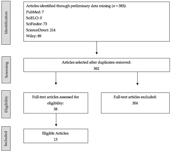 Based on the PRISMA guidelines [31], the present review article was developed by selecting articles from the following scientific databases: PubMed (https://pubmed.ncbi.nlm.nih.gov/, accessed on 8 December 2021), SciELO (https://scielo.org/, accessed on 8 December 2021), ScienceDirect (https://www.sciencedirect.com/, accessed on 3 December 2021), SciFinder (https://scifinder.cas.org, accessed on 7 December 2021), and Wiley (https://onlinelibrary.wiley.com/, accessed on 6 December 2021). Mendeley software (https://www.mendeley.com/, accessed on 6 December 2021) was used to manage all bibliography references, and the search for and selection of the articles were independently performed by three researchers (i.e., LS, NRM, and MR) in a manner that avoided the duplication of data. The following keywords were used: “Zingiber officinale essential oil” and “Fusarium”. Both keywords were searched individually and in combination. Although we considered the literature of the past 20 years, we also included some key data in the Introduction and Discussion sections. Tables were prepared to represent the following criteria: the country where the research was performed, the main compounds found in the oil, the assay, the pathogen species, the results concerning antimicrobial activity, and the positive and negative controls. As reported in Figure 2, the above-mentioned criteria allowed the selection of 13 eligible articles, excluding 45 articles that did not meet the selection methodology either due to incomplete information or because they simply mentioned data concerning Fusarium infection without focusing on the topic of the present study.