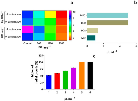 Microbiological effects of EOs of Z. officinale. (a) Effect of Z. officinale EO on growth (top) and ochratoxin A (OTA) production (bottom) in fungi in maize grains [62]; (b) effectiveness; and (c) inhibitory effect of Z. officinale EOs on the growth of F. oxysporum [39].